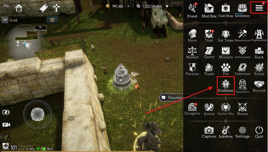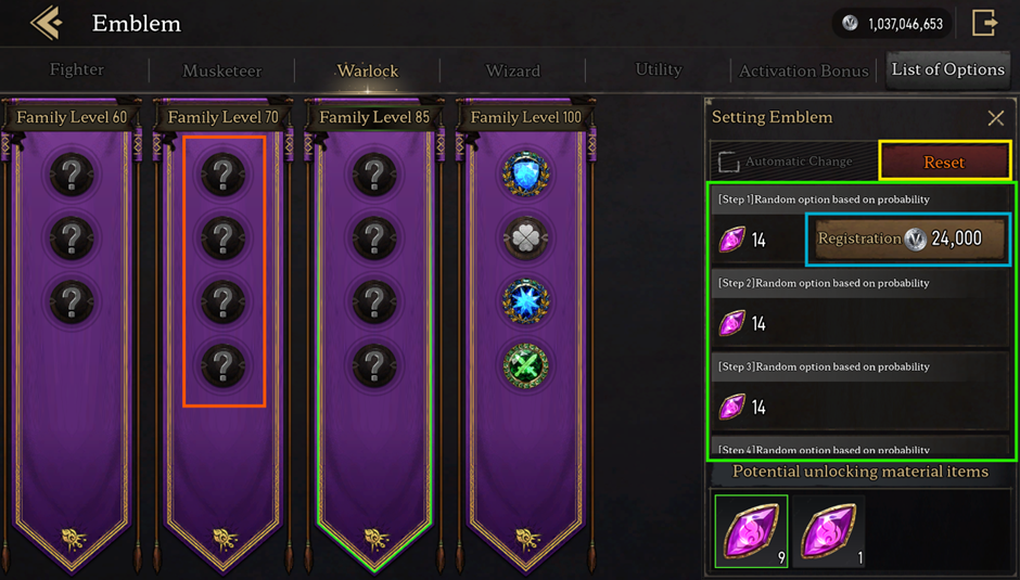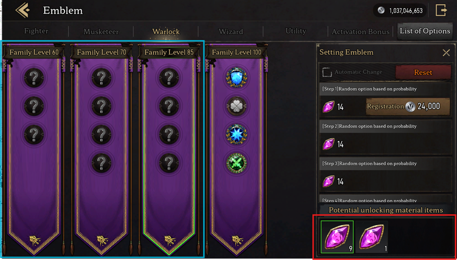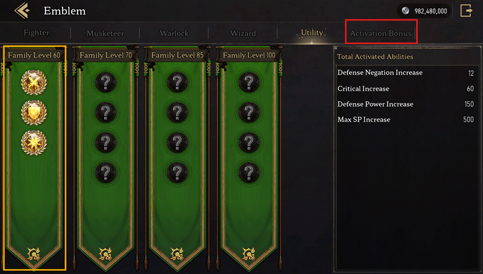 - Once opened, players are able to View, Register, and Enhance their respective Family Emblem.