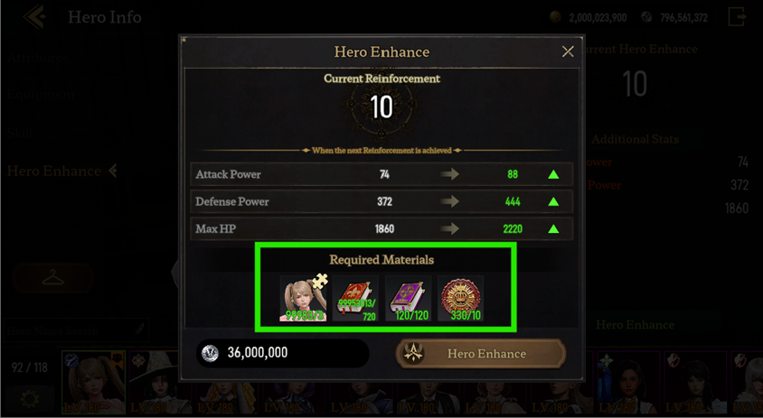 - Players can Enhance (Blue Box) the Hero using Hero Pieces, Combat Book, Book of Ancient Era (Green Box), and Seal of Honor.