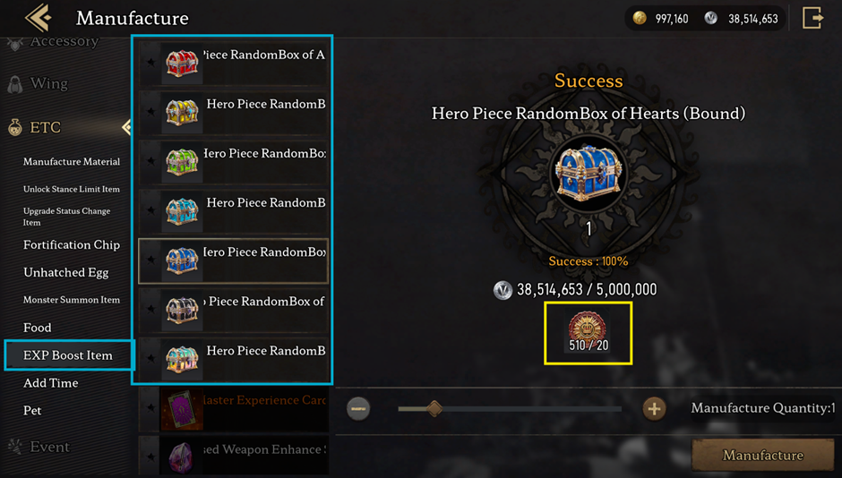 -In order to Manufacture Hero Piece Chest, players need to Dismantle unwanted Hero Pieces.