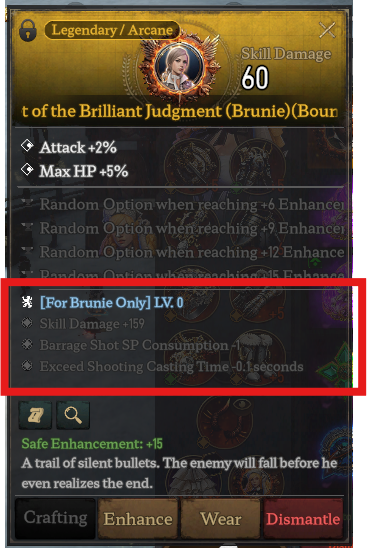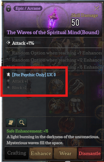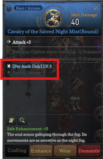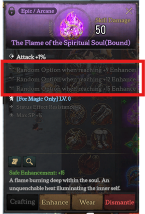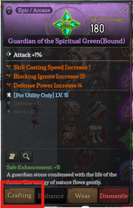 Crafting is unlocked once an Arcane reaches Maximum Enhancement Level (Lev. 15). Here, players can Craft them and Change their Stat lines, and Value.